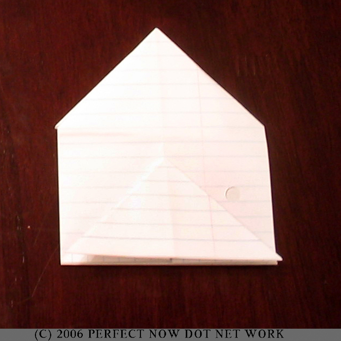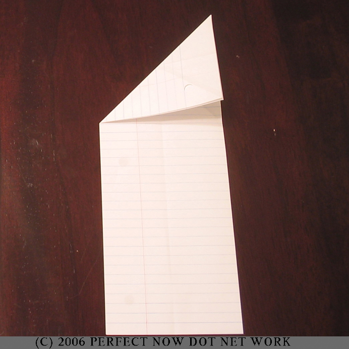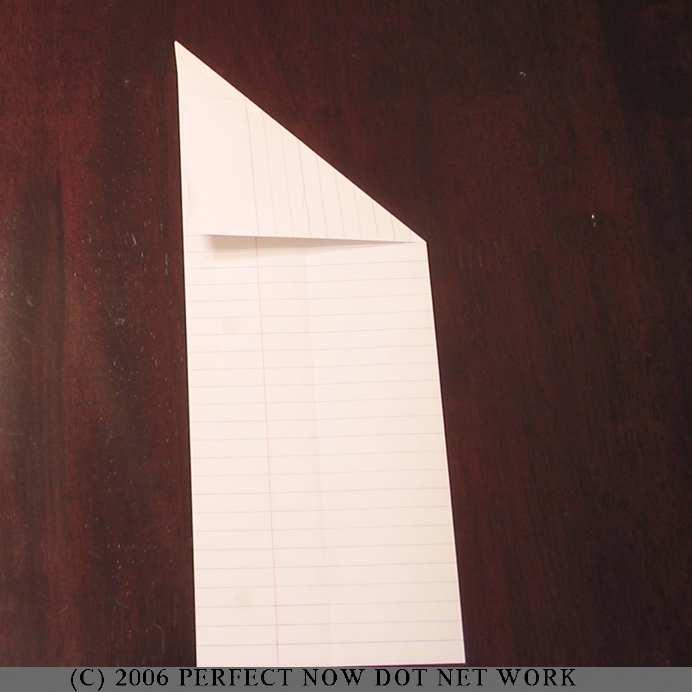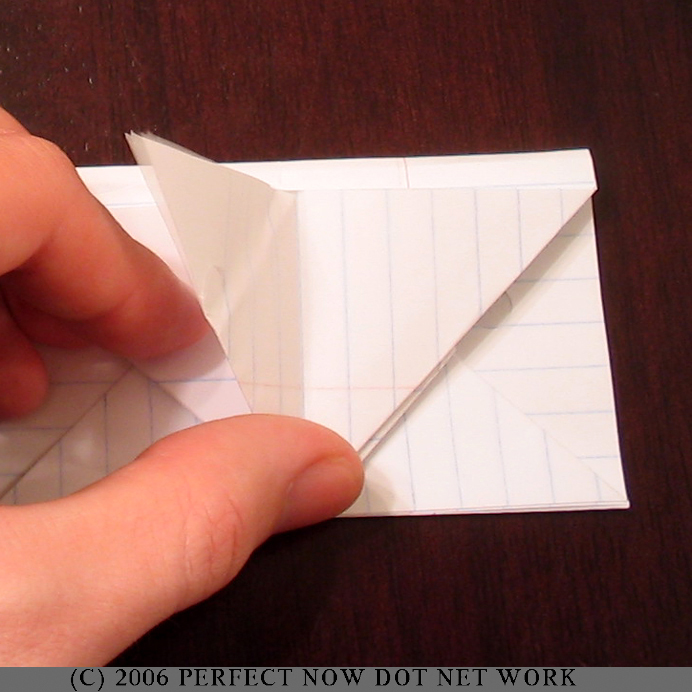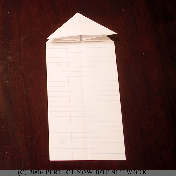 Fold the point of the upper triangle down so it meets the base of the lower triangle. It is okay if the base of the upper triangle does NOT lie flush with the top of the paper. It is important that the point of the upper triangle meets the base of the lower triangle.