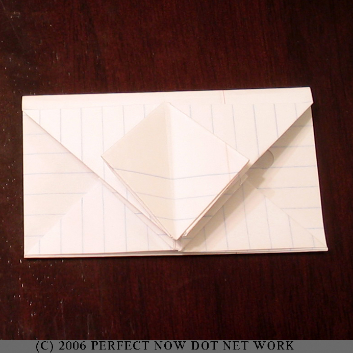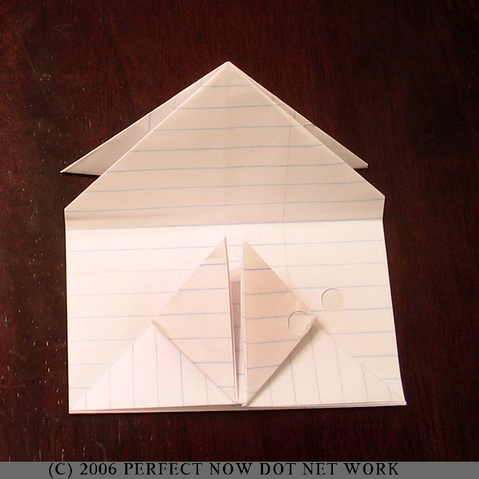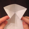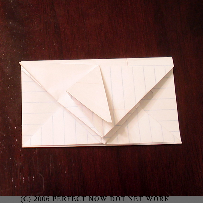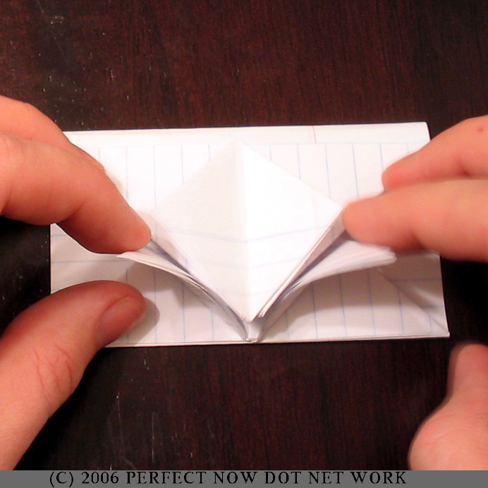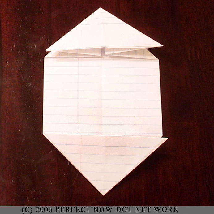 Unfold the upper triangle. Take the right flap and fold the point to the point of the triangle. Repeat for the left flap. You will know have a diamond in the middle of the triangle.